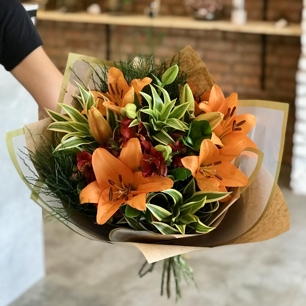 4 hastes de Lírios ( as cores dos Lírios podem variar de acordo com a disponibilidade do dia, podendo ser amarelo, laranja, branco ou cor de rosa )