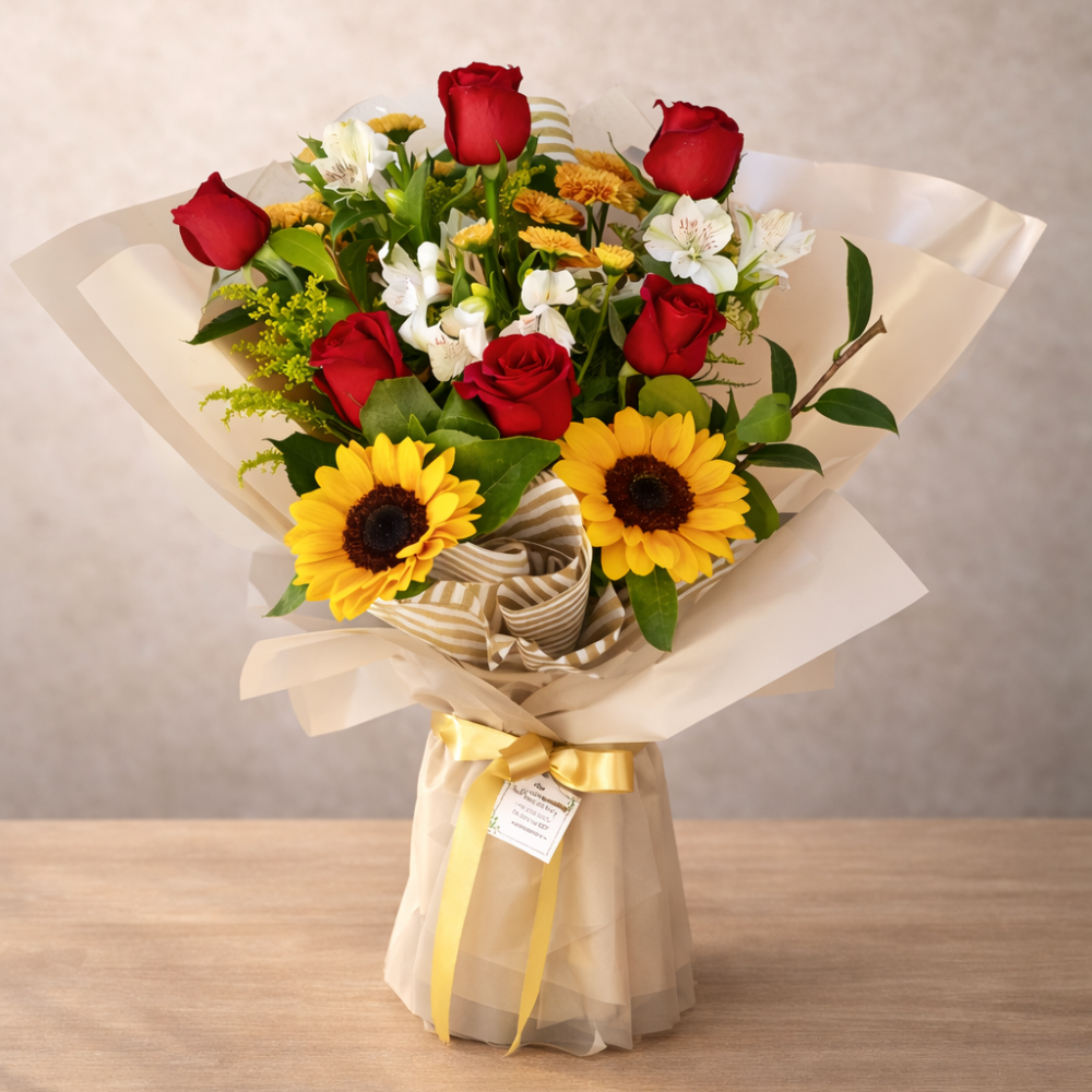 O Buquê Rosas e Girassóis – Edição Aurora une o romantismo das rosas vermelhas à energia radiante dos girassóis, criando um arranjo marcante e cheio de personalidade.