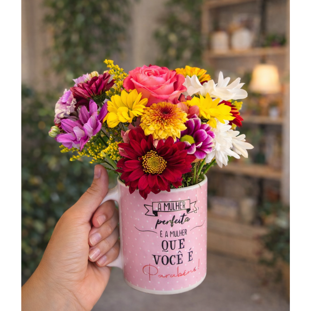 Caneca de cerâmica decorada com 1 rosa e mix de flores do campo