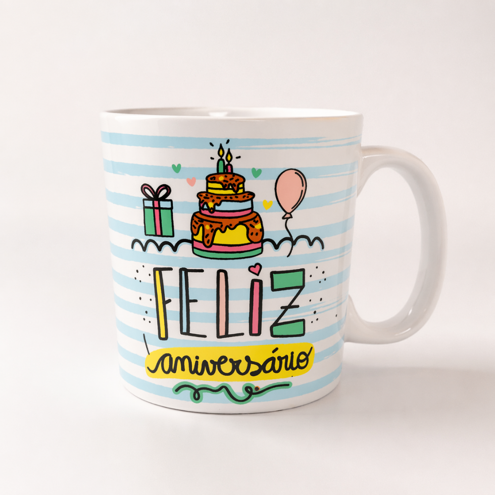 caneca de cerâmica 320ml decorada com frase ” Feliz Aniversário”
