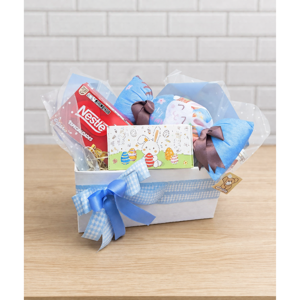 Caixa com almofada decorativa que traz conforto e afeto, chocolates Nestlé que despertam o sabor da Páscoa, além de uma charmosa caixa temática com bombons sonho de valsa e ouro branco, que completam a experiência com um toque delicado e festivo.