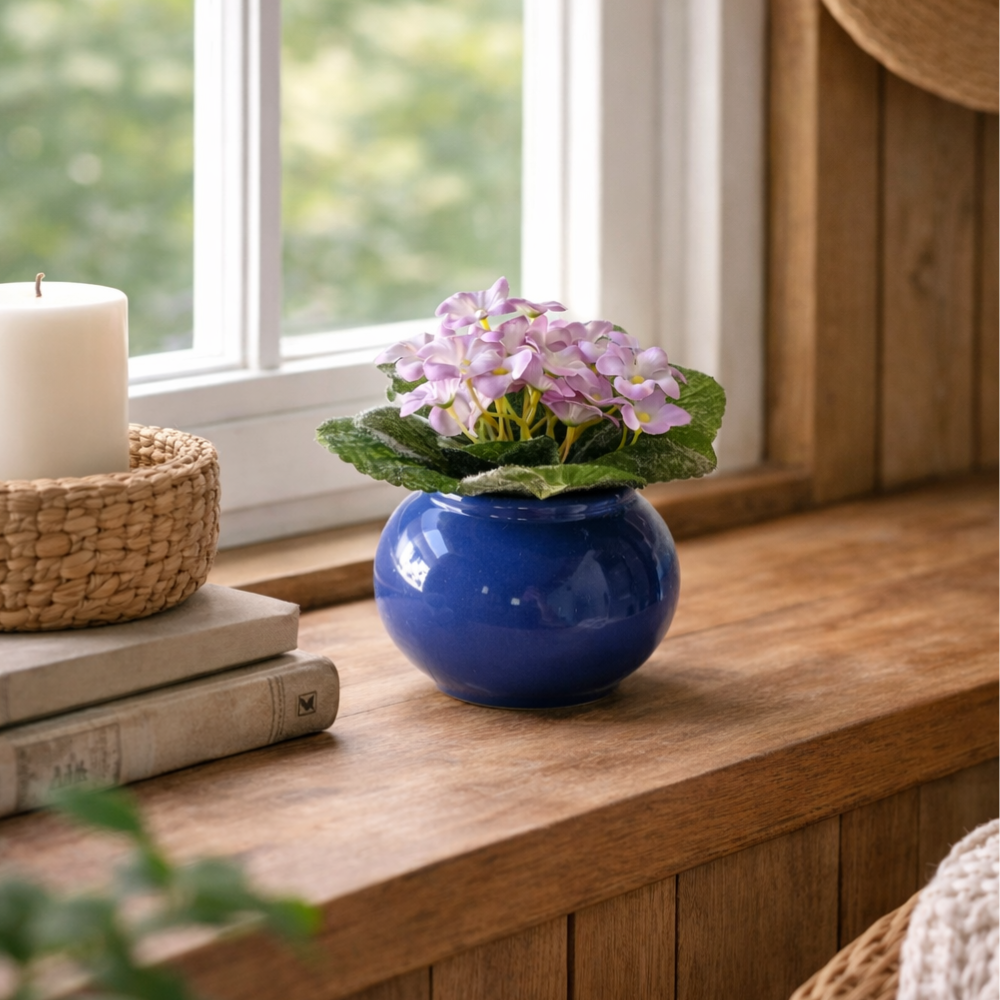 Arranjo permanente composto por violetas artificiais em tom lilás, com folhas verdes texturizadas, acomodadas em vaso de cerâmica esmaltada azul com formato arredondado.