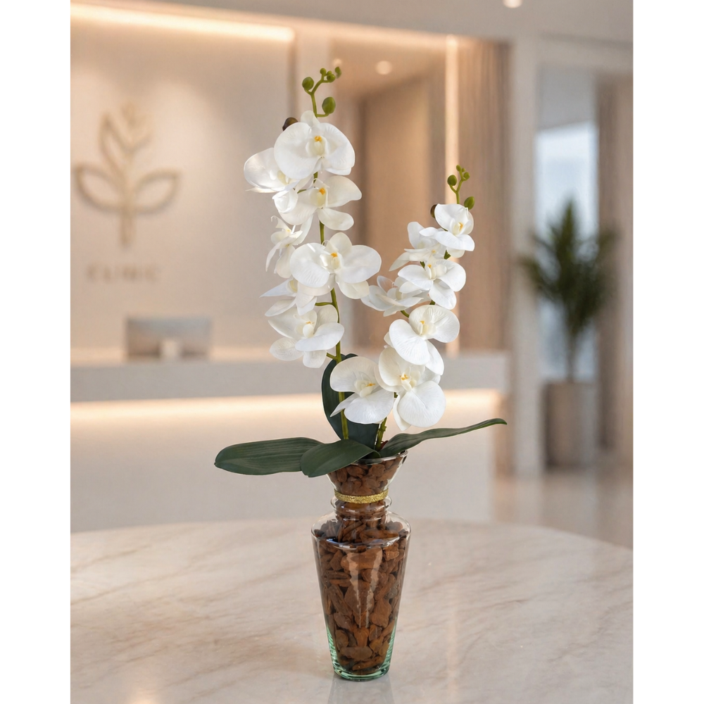 Arranjo de orquídea branca com 2 hastes artificial permanente, indicado para decoração de ambientes internos.