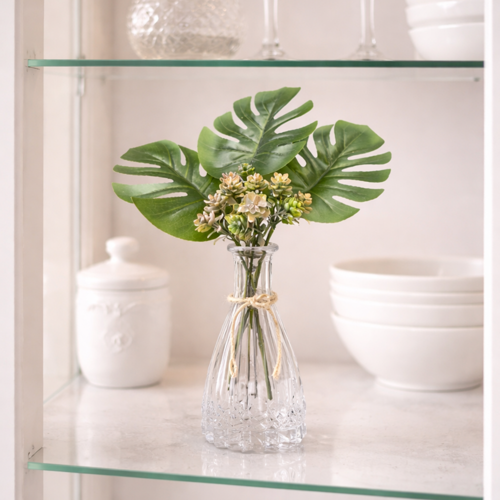 Composto por folhas de costela de adão e suculentas ornamentais, este arranjo é montado em um elegante vaso de vidro trabalhado, finalizado com detalhe em corda que adiciona um toque natural e delicado à peça.