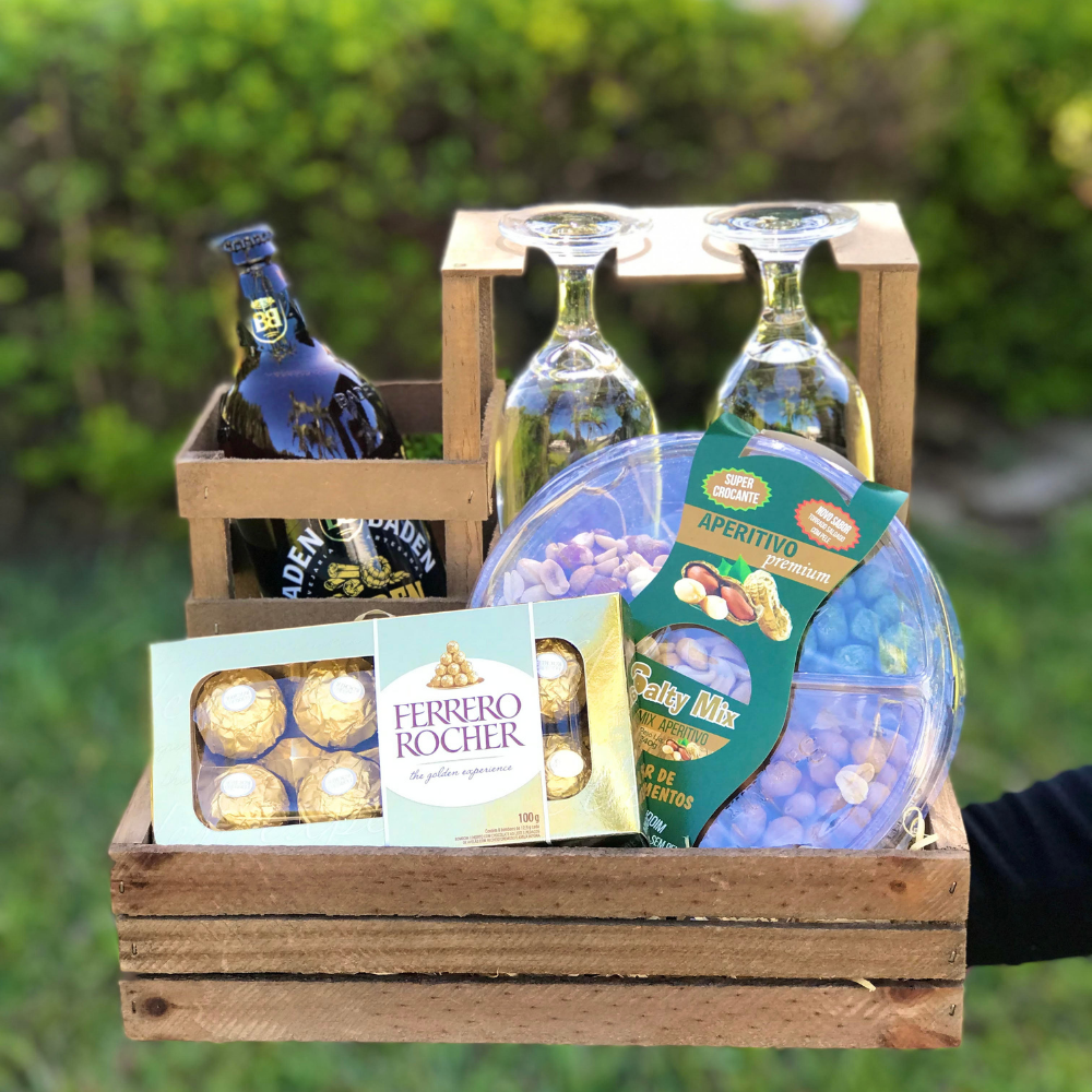 Suporte de cerveja premium Baden Baden, taças, Ferrero Rocher e mix aperitivo.